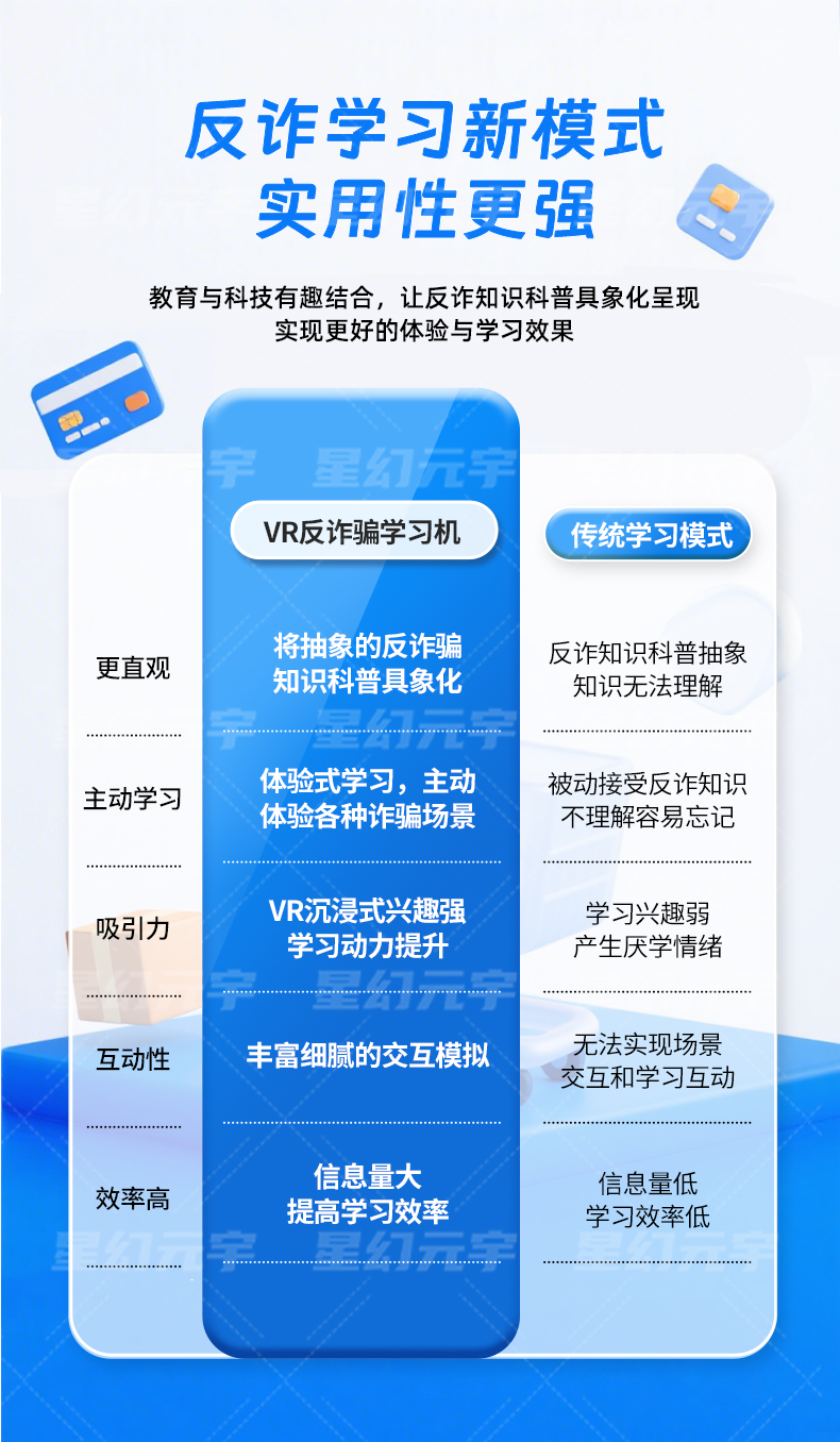 VR 技术凭借其沉浸式、交互式的优势,为反诈教育和法治科普提供了创新路径。VR 反诈骗学习机应运而生,旨在通过技术赋能,打破传统教育的局限,构建更高效、更生动的反诈学习体系,助力筑牢全民反诈防护墙。