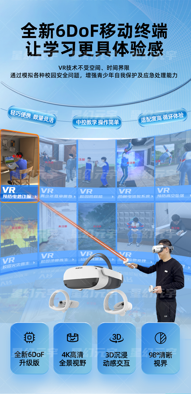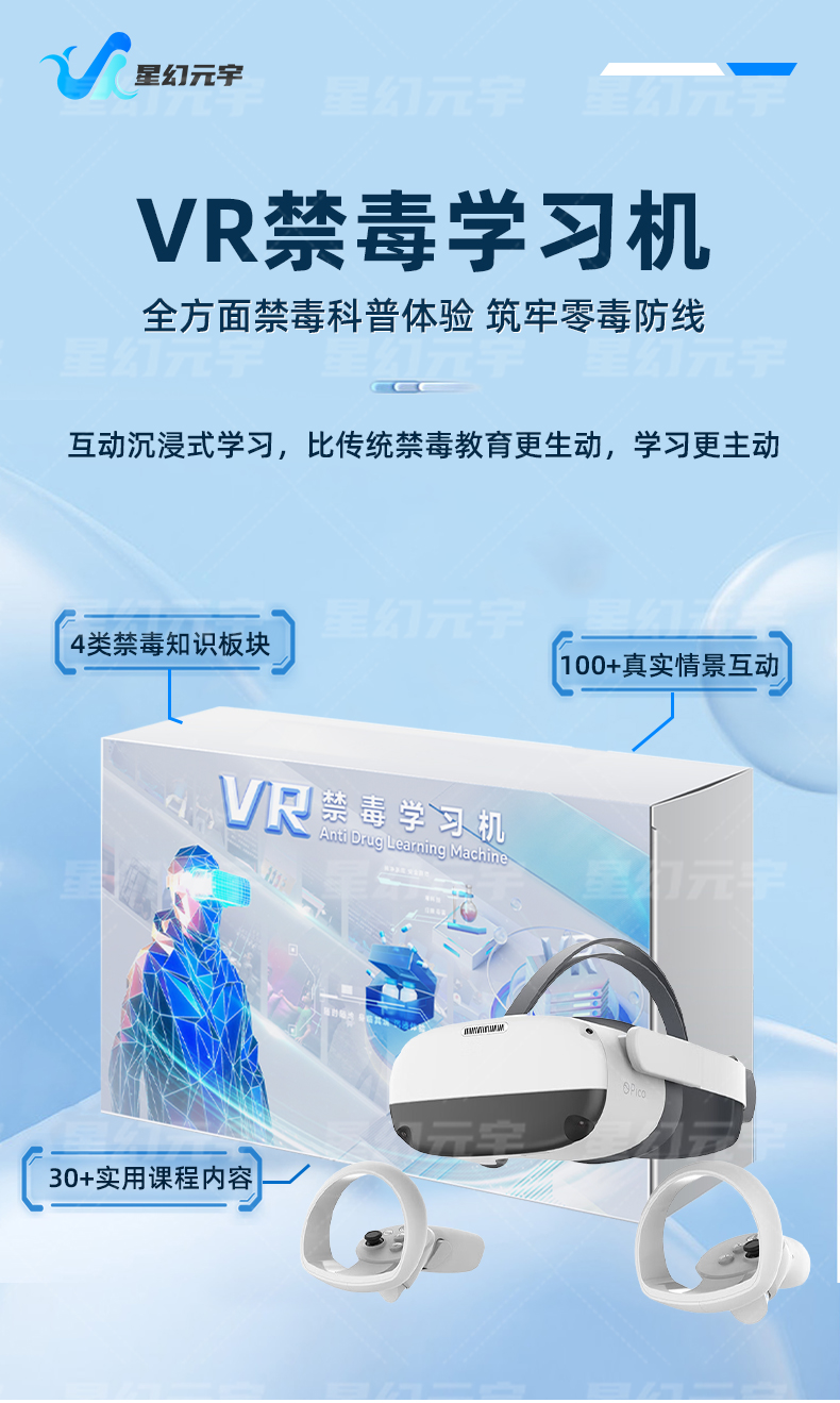 4、部署灵活,成本可控:支持单人 VR 设备体验,也可搭配一体机实现多人集体教学,设备体积小,可灵活放置在校园禁毒角、实验室、多媒体教室,无需大规模改造场地。