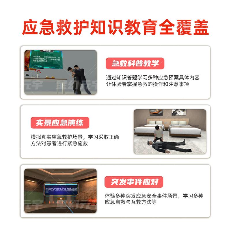 企业员工:聚焦 “工作场景安全”,模拟 “车间工伤包扎、触电应急处理、火灾现场救援” 等场景,提升员工在工作中应对突发事故的能力,减少企业安全损失。