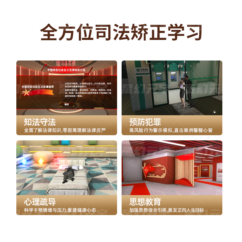 设备搭载高性能纯净系统,支持 VR + 大屏双模式,为矫正对象提供全景式司法矫正教育体验。