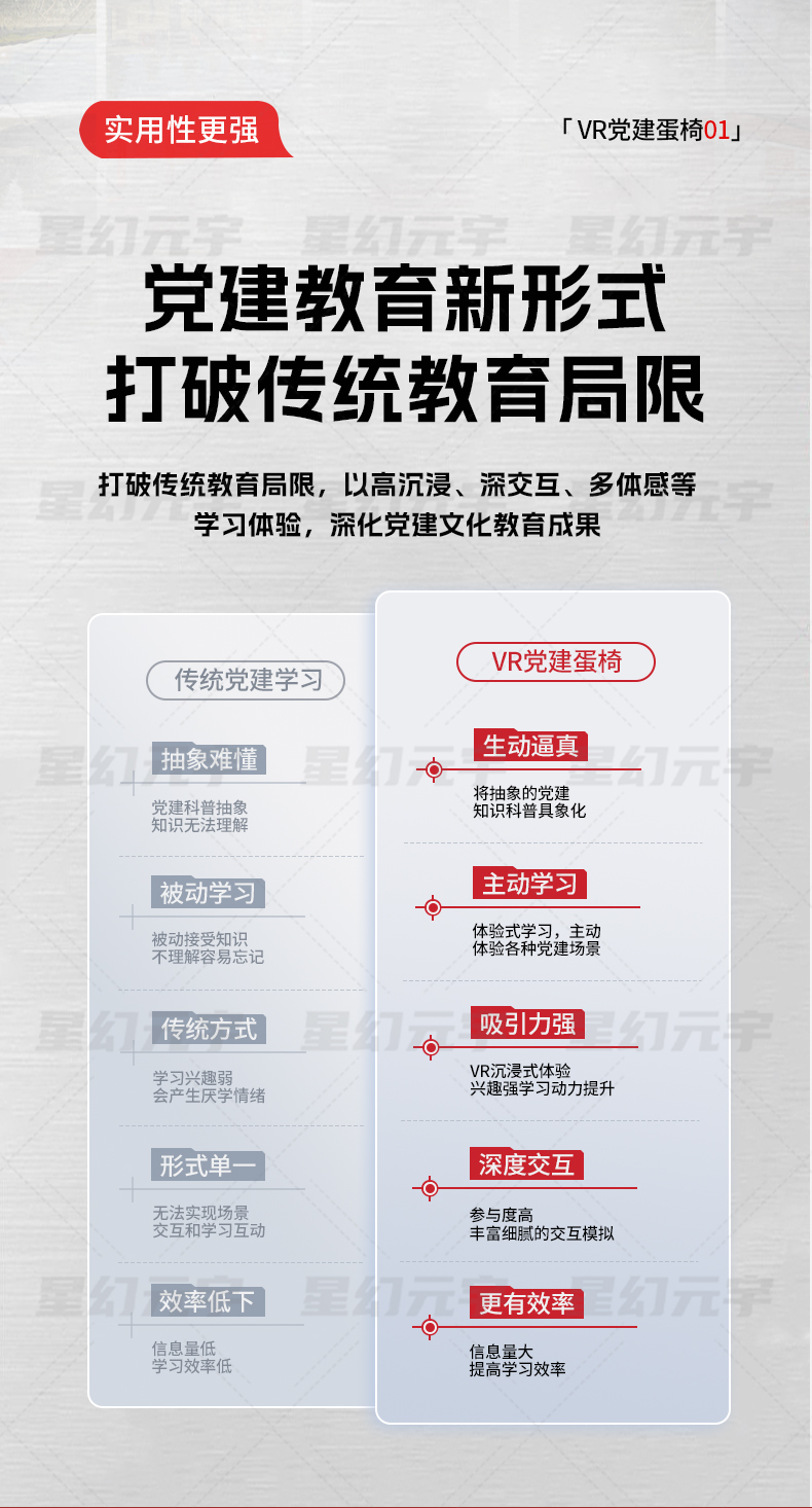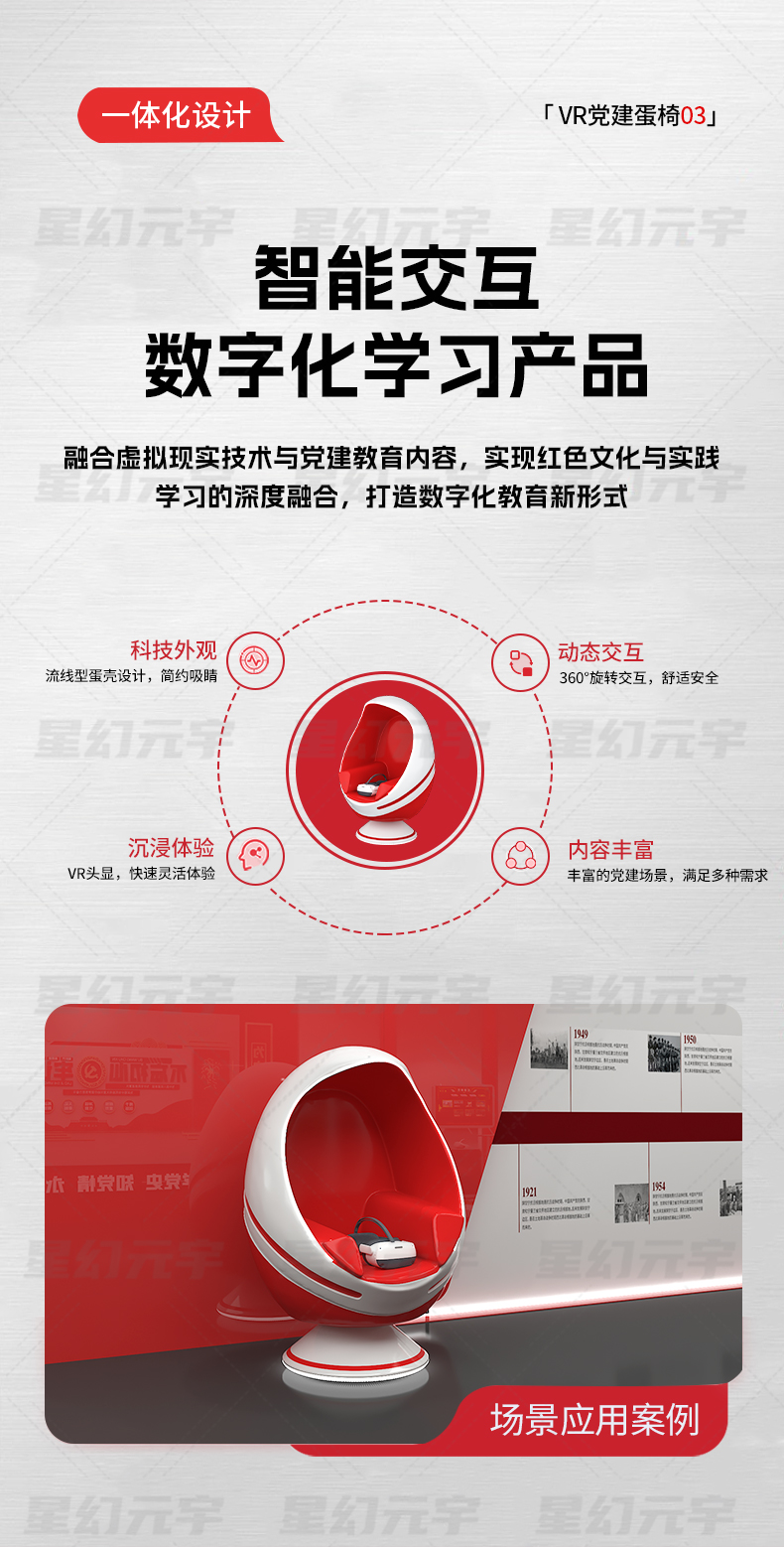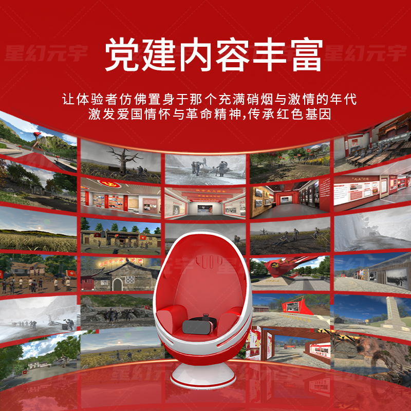 在红色文化传承与党建教育不断深化的当下,传统党建学习模式逐渐显现出诸多局限。同时,随着数字化技术在教育领域的广泛应用, VR 党建蛋椅应运而生,它融合虚拟现实技术与党建教育内容,打造数字化党建教育新形式,助力红色文化与实践学习深度融合。