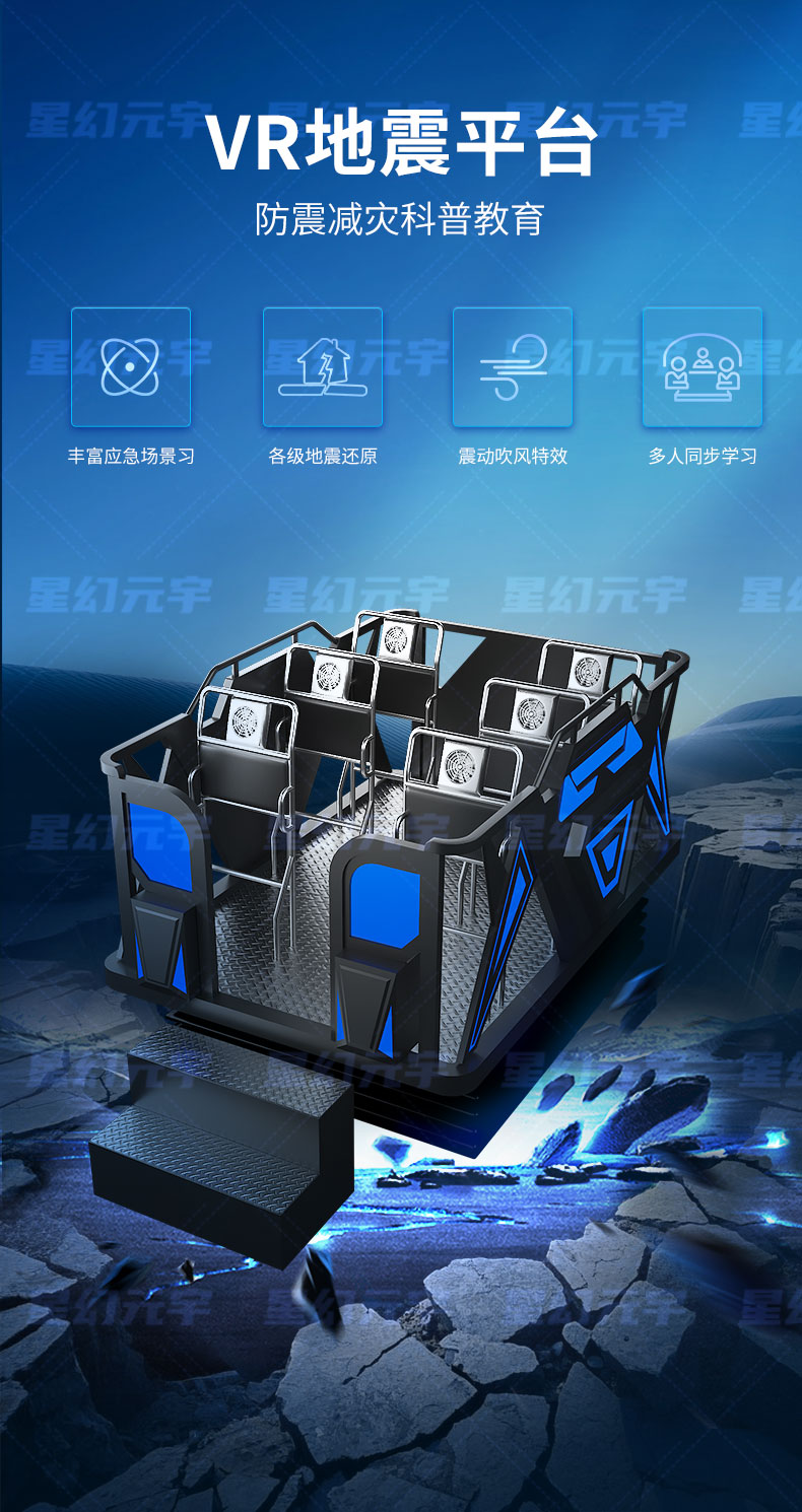 VR 地震平台是一款以 “真实模拟、安全体验、学娱一体” 为核心的全新动感体验平台,通过 VR 技术、动感硬件装置与多感官的结合,为用户打造身临其境的自然灾害体验与科普学习环境,涵盖地震、台风、暴雨、雪灾等多个自然灾害避险科普内容,助力用户在零危险环境中学会多种应急技能。