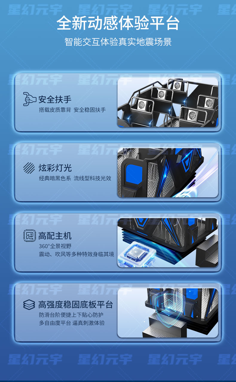 VR 地震平台通过 VR 头显的 360° 全景视野、多自由度平台的震动反馈、吹风的触觉刺激以炫彩灯光的视觉氛围营造,实现多感官同步联动。用户仿佛真正置身于自然灾害现场,这种强烈的沉浸式体验能大激发学习兴趣,让用户对避险知识和应急技能产生深刻记忆,避免 “学完就忘” 的问题。