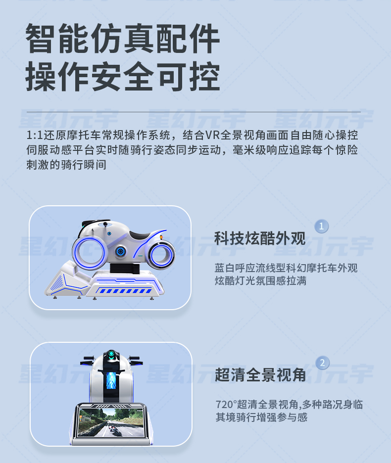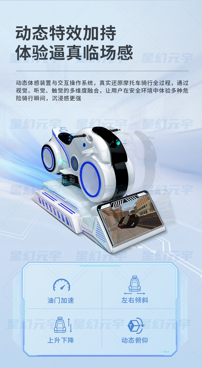 配备动态体感装置,模拟摩托车加速、减速、转弯时的车身倾斜、震动反馈;搭配专属骑行操控组件,操作逻辑与真实摩托车一致,让用户通过手部、身体动作完成转向、调速等操作,触觉反馈同步匹配场景,强化骑行代入感。