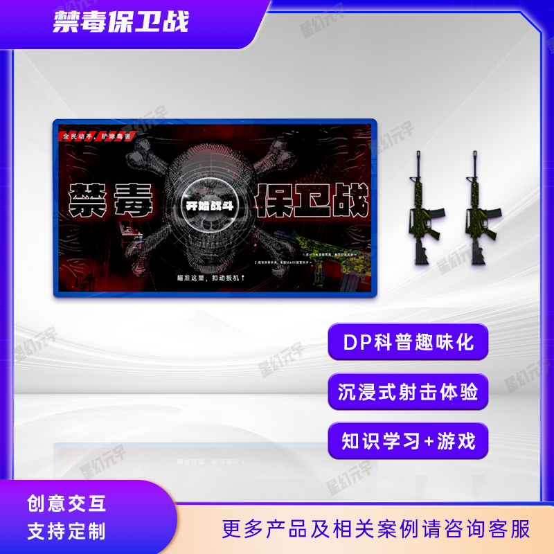 - 知识与体验深度绑定:区别于 “游戏与教育脱节” 的传统产品,该产品将禁毒知识与射击环节紧密结合 —— 消灭不同 “DP角色” 对应不同的禁毒知识点,体验者若想顺利完成 “保卫战”,需在射击过程中主动关注知识提示,形成 “射击互动→知识接收→强化认知” 的闭环,避免 “只玩不学”,确保教育实效。