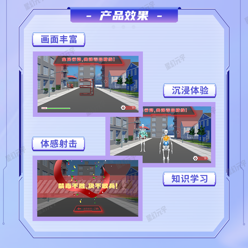 传统禁毒教育常以案例讲解、图文宣传为主,内容严肃枯燥,尤其对青少年群体缺乏吸引力,难以让防毒、拒毒意识真正入脑入心。“禁毒保卫战” 产品以 “教育游戏化、体验沉浸式” 为核心定位,创新融合禁毒教育与射击互动体验,摒弃单向知识灌输模式,将抽象的禁毒知识转化为具象的虚拟射击场景,让体验者在 “消灭DP威胁” 的游戏化过程中,主动学习DP知识、感知DP危害,实现 “玩中学、学中防”,为禁毒教育开辟趣味化、实效化新路径。
