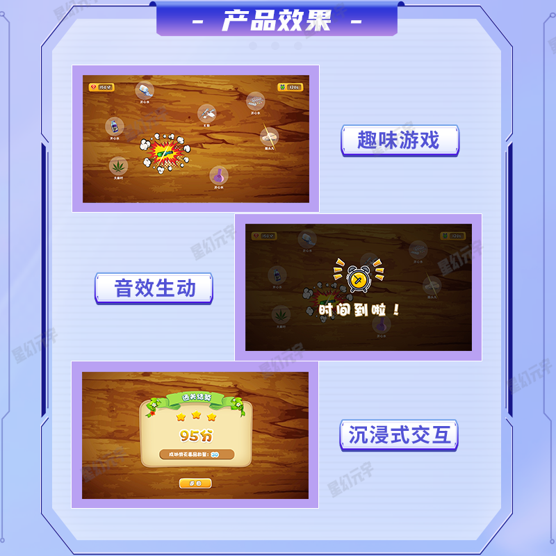 1、在功能上,产品借助体感摄像头动态捕捉人体动作,体验者以手臂为 “刀刃”,通过肢体动作的变化隔空切除虚拟场景中的 DP 形象。操作过程中,伴随 DP 被切割的破碎,交互效果生动逼真,增强游戏的沉浸感。同时,产品搭配倒计时与得分统计功能,营造紧张有趣的游戏氛围,激励公众主动积参与。